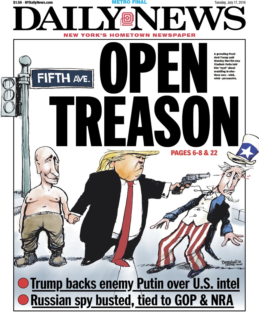 Is Donald Trump not merely gullible, uninformed, and indifferent but actually treasonous when it comes to Russia? More and more high-profile people are saying so. He’s acting like “a Russian mole,” in the words of conservative columnist Max Boot (www.washingtonpost.com/opinions/global-opinions/trump-is-pushing-the-atlantic-alliance-to-the-breaking-point/2018/06/30/c054f0dc-7c8e-11e8-80be-6d32e182a3bc_story.html). “America is under attack and its president absolutely refuses to defend it. Simply put, Trump is a traitor and may well be treasonous,” argues New York Times op-ed writer Charles M. Blow (www.nytimes.com/2018/07/15/opinion/trump-russia-investigation-putin.html). The former CIA director, John Brennan, tweets that “Donald Trump’s press conference performance in Helsinki rises to & exceeds the threshold of ‘high crimes & misdemeanors.’ It was nothing short of treasonous” (https://www.cnn.com/2018/07/16/politics/john-brennan-donald-trump-treasonous-vladimir-putin/index.html). And John McLaughlin, former acting director of the CIA, calls Trump an “agent of influence” for Russia (MSNBC interview, July 16, 2018).