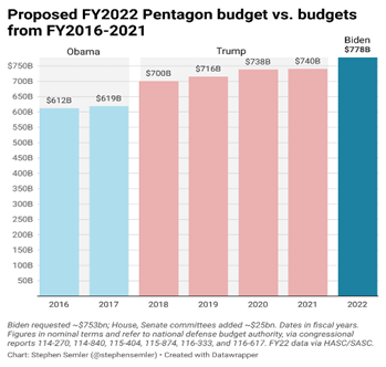 Let’s look at those corporate-Pentagon contracts. Total prime contracting in the current fiscal year (FY) is $447 billion, a jump of $42 billion over FY2020 and over $300 billion since FY2016. These contracts account for about two-thirds of all federal contracting ($682 billion) during those years. Under Biden, large increases continue—and Congress is adding on to his proposals. Thus, for FY2022, Biden has proposed $753 billion in military spending, to which Congress has added $25 billion (https://stephensemler.substack.com/p/do-barbara-lee-and-mark-pocan-have). The chart below shows the year-to-year jumps in official military spending. (Keep in mind, as I pointed out in Post #301, that the real FY2022 budget request is more like $1 trillion when other military-related expenditures, such as for veterans, are included.)