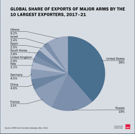 As the first chart below shows, the US is by far the leading arms exporter at 39 percent of the world total, followed by Russia and France. China and Germany are a distant fourth and fifth. Europe accounts for 13 percent of global arms transfers and is the major growth region in arms imports. Other regions with significant increases in arms imports are Oceania, thanks mainly to Australia’s 62-percent increase in arms imports, and East Asia, which grew by 20 percent. The US is the major arms supplier to both Asia and Oceania; rivalry with China is the principal rationale. Overall, arms imports were down in the Americas and Africa, but up in the Middle East, especially Israel and Egypt (https://sipri.org/media/press-release/2022/global-arms-trade-falls-slightly-imports-europe-east-asia-and-oceania-rise).