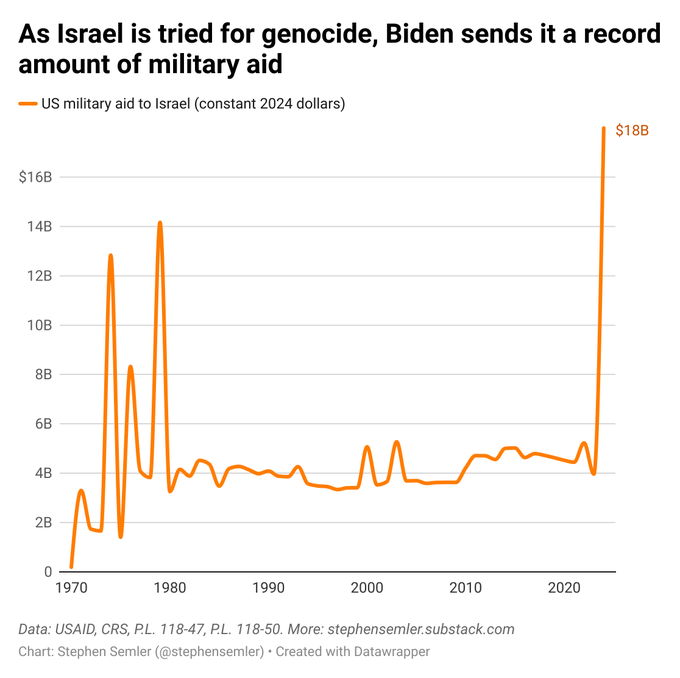 That view amounts to whistling in the dark, since the fighting has clearly overtaken the diplomatic process. A two-state solution seems farther away than ever. And the US is contributing to the increasingly dire situation by refusing to hold back, much less embargo, arms shipments to Israel. Saying Israel needs to change “some policies” is fantasy. Fact is, Israel is calling the shots, as it has throughout this war. The longer the war goes on, and the more it expands, the less influence the US seems to have—as witness the swift rejection of the US-France cease-fire proposal—and (as the chart below by @StephenSemler shows) the more Israel gets from the US in military aid. Hardly what the textbooks say about great-power politics.